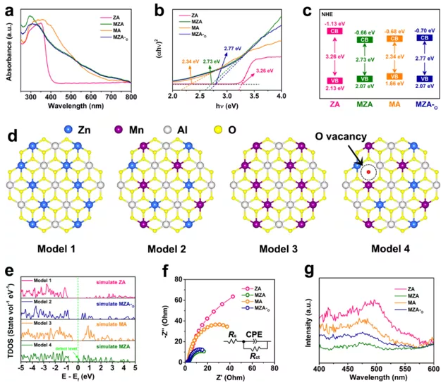 在本研究中,我們旨在揭示金屬取代效應(yīng)增強(qiáng)LDH光催化性能的機(jī)理,特別是闡明錳取代和氧空位對提高M(jìn)ZA光催化活性的貢獻(xiàn)。紫外可見吸收光譜(圖2a)和帶隙寬度(圖2b)顯示與ZA和MA相比,MZA的帶隙更適合光催化反應(yīng)。值得注意的是,MZA的帶隙比MZA-o略窄,這意味著帶隙的縮短不僅來自Mn取代,O空位在這個過程中也起到了一定的輔助作用。圖2c顯示了催化劑的能帶結(jié)構(gòu),觀察到MZA和MZA-o的價帶位置相近,而MZA的導(dǎo)帶低于MZA-o,說明氧空位對縮短帶隙的作用機(jī)制是降低導(dǎo)帶。在密度泛函理論計算中我們補(bǔ)充了模型4(圖2d),即具有一個氧空位的模型2(氧空位位置的選擇遵循最低總能量的原則),并計算了模型1-4的總態(tài)密度(TDOS)。如圖2e所示,模型的帶隙順序與圖2b中實驗確定的帶隙結(jié)果一致,其中模型2和模型4具有非常相似的能帶結(jié)構(gòu),兩者的區(qū)別在于模型4的能帶結(jié)構(gòu)中出現(xiàn)了一個明顯的中間能級,這表明O空位對縮短帶隙的貢獻(xiàn)是通過缺陷能級的形成來實現(xiàn)的。因此我們認(rèn)為Mn取代和O空位的協(xié)同作用是帶隙縮短的原因,其中Mn取代的貢獻(xiàn)占主導(dǎo)地位,O空位的作用相對較弱。此外,催化劑的阻抗譜(圖2f)和穩(wěn)態(tài)熒光光譜(圖2g)的結(jié)果進(jìn)一步證實了MZA的優(yōu)異光催化活性歸因于Mn取代和O空位,并且在提高載流子轉(zhuǎn)移能力方面,Mn取代的貢獻(xiàn)仍然大于O空位。