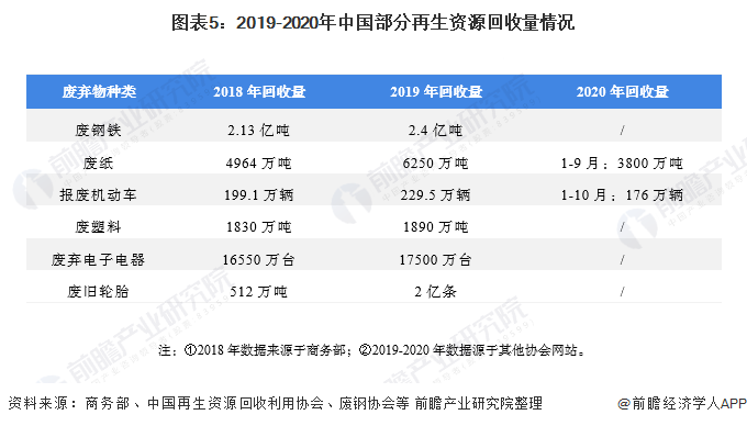 同時,根據(jù)資料的公開程度,前瞻整理了2019-2020年部分再生資源的回收情況,可以看出,與2018年相比,2019年廢棄物的回收量都有所增加,一定程度上說明行業(yè)的回收經(jīng)營情況較為穩(wěn)定:
