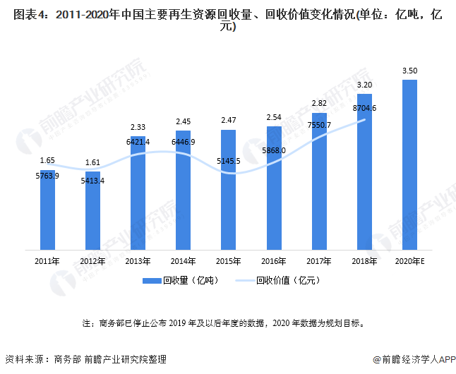 此外,根據(jù)工信部、商務部、科技部發(fā)布的《關于加快推進再生資源產(chǎn)業(yè)發(fā)展的指導意見》中提出的發(fā)展目標,到2020年,全國再生資源回收利用量達到3.5億噸。