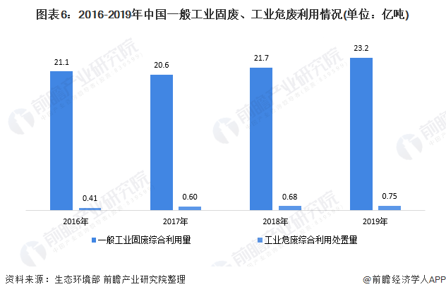 另從加工處置的角度來看,據(jù)生態(tài)環(huán)境部的統(tǒng)計數(shù)據(jù)顯示,2015-2019年,全國一般工業(yè)固廢和工業(yè)廢物的綜合利用量總體上升。2019年,全國一般工業(yè)固廢的綜合利用量為23.2億噸,工業(yè)危廢的綜合利用處置量為0.75億噸。