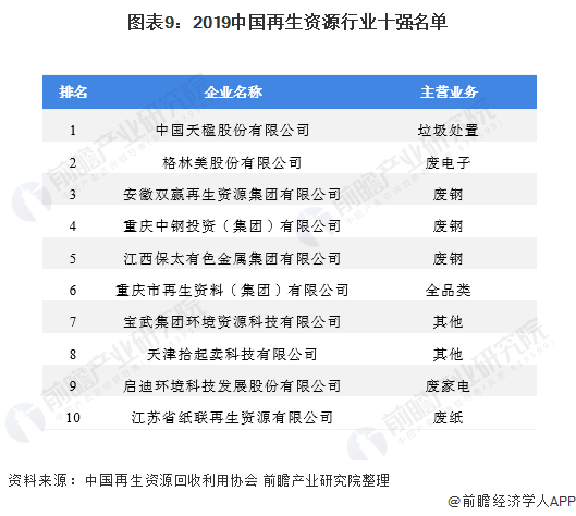 在企業(yè)競爭格局方面,由于再生資源行業(yè)的業(yè)務范圍廣,行業(yè)的競爭者數(shù)量較多,但根據(jù)廢棄物種類的不同,各個企業(yè)的重點業(yè)務有所不同。2020年12月末,中國再生資源回收利用協(xié)會公布了《2019年中國再生資源行業(yè)50強榜單》,其中,TOP10企業(yè)的排名情況如下,廢鋼回收處利用市場的上榜企業(yè)較多: