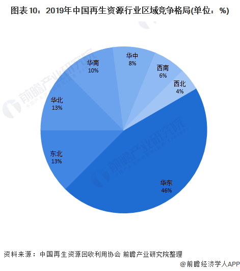 在區(qū)域競爭格局方面,從2019年我國再生資源行業(yè)50強企業(yè)的注冊地分布來看,華東地區(qū)的上榜企業(yè)數(shù)量最多,占比達46%,其中江蘇省的競爭實力最強。