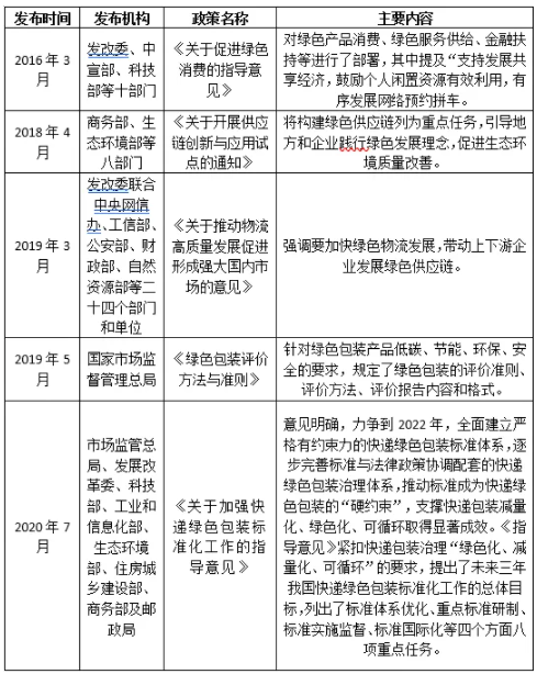 近年來,對于電子商務行業(yè),我國政府部門發(fā)布系列相關(guān)政策,指引和倡導電商企業(yè)在綠色消費、綠色包裝、綠色物流、綠色供應等方面做出行動來減少碳排放量。主要政策梳理如下: