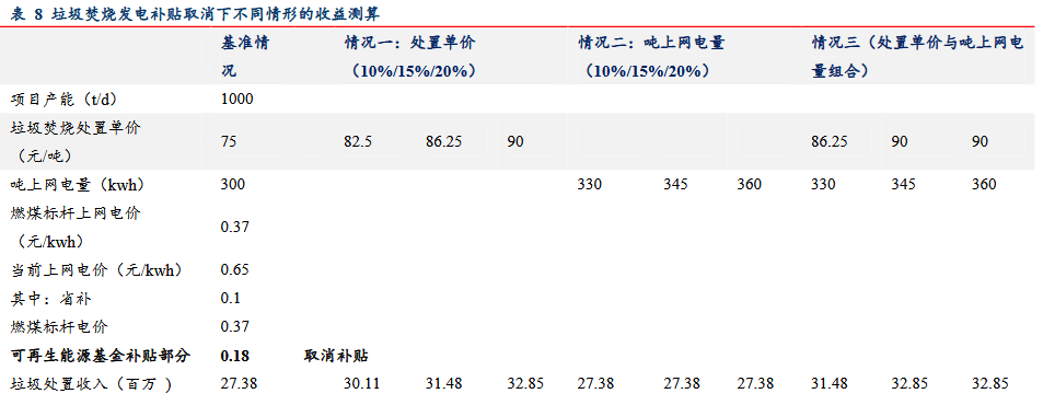 對補(bǔ)貼取消、參與CCER模擬不同價格情形進(jìn)行測算,單噸發(fā)電量從300kwh提升至360kwh(增加20%),處置單價由75元/噸提升至90元/噸(增加33.33%),CCER交易價格為50元/噸時,可基本對沖可再生能源基金補(bǔ)貼退坡影響。