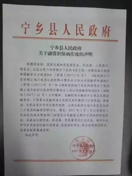 8月23日,網(wǎng)傳寧鄉(xiāng)縣政府融資擔保函作廢的聲明