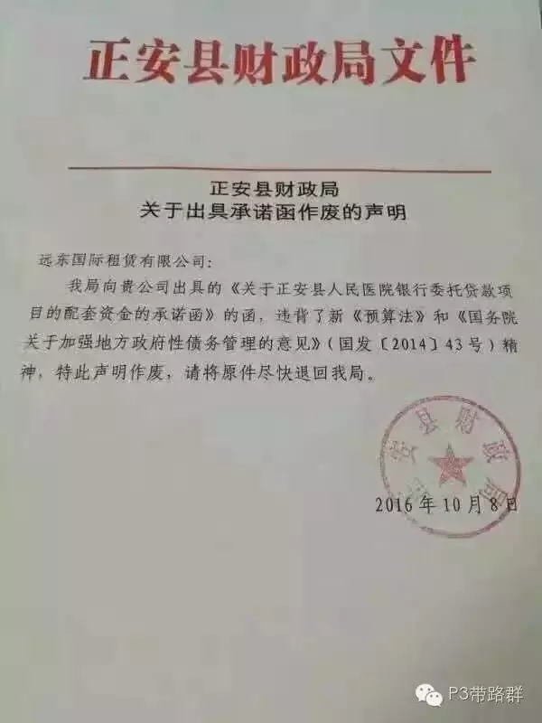 在地方債務(wù)“嚴監(jiān)管”常態(tài)化以及此番地方政府舉債融資“史上最嚴大排查”收官在即的大背景下,地方政府迫于監(jiān)管壓力,撤回融資擔保承諾函的事件可謂屢見不鮮,其中涉及租賃公司的有:2016年10月,貴州省多個地市級財政局就曾密集申明承諾函作廢并要求限時退回原件。事件涉及正安、安順、遵義三市區(qū)財政局,并將國泰租賃、遠東國際租賃和中信信托卷入其中。
