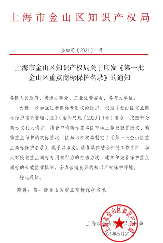 為進(jìn)一步加強(qiáng)注冊(cè)商標(biāo)專用權(quán)的保護(hù),根據(jù)《上海市金山區(qū)重點(diǎn)商標(biāo)保護(hù)名錄管理辦法》(金知局規(guī)〔2021〕1號(hào))要求,上海市金山區(qū)知識(shí)產(chǎn)權(quán)局領(lǐng)導(dǎo)經(jīng)過數(shù)月評(píng)審討論,結(jié)合申請(qǐng)商標(biāo)在市場上易被假冒侵權(quán)、確需重點(diǎn)保護(hù)的實(shí)際情況,于近日頒布《第一批金山區(qū)重點(diǎn)商標(biāo)保護(hù)名錄》,上海江浪科技股份有限公司成功入圍,企業(yè)實(shí)力再獲權(quán)威認(rèn)證!