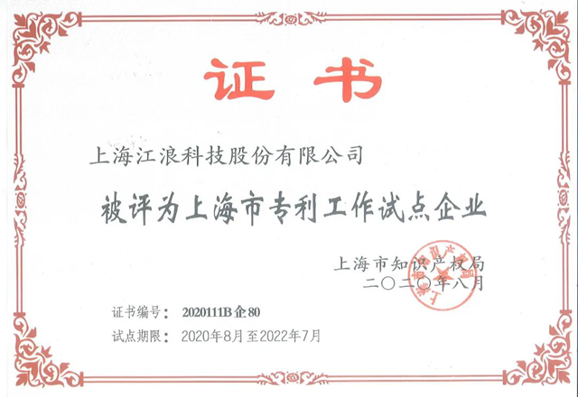 “上海市專利工作試點(diǎn)企業(yè)”是江浪科技繼獲評(píng)“上海市高新技術(shù)企業(yè)”、“上海市專精特新企業(yè)”之后獲得的又一項(xiàng)榮譽(yù)。