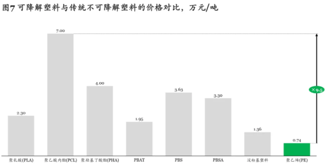 不可降解塑料如PP、PET、 PE等價(jià)格較低,可降解塑料價(jià)格明顯高于它們,目前主流可降解塑料如PLA、PHA、 PBAT的價(jià)格分別在1.6-3萬元/噸、4萬元/噸、1.4-2.5萬元/噸左右,是PE價(jià)格的2~5倍, 而PCL 的價(jià)格甚至高達(dá)7萬元/噸,是PE價(jià)格的9.5倍(見圖7)。