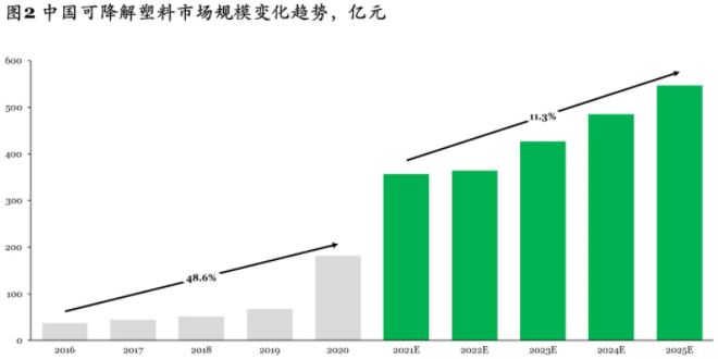 受此影響,作為傳統(tǒng)塑料替代產(chǎn)品的可降解塑料市場(chǎng)大幅度增長(zhǎng),訂單暴增,我們預(yù)計(jì)“十四五”期間,可降解塑料市場(chǎng)將以11.3%的年復(fù)合增速,到2025年實(shí)現(xiàn)500億元以上的收入規(guī)模(見圖2)。