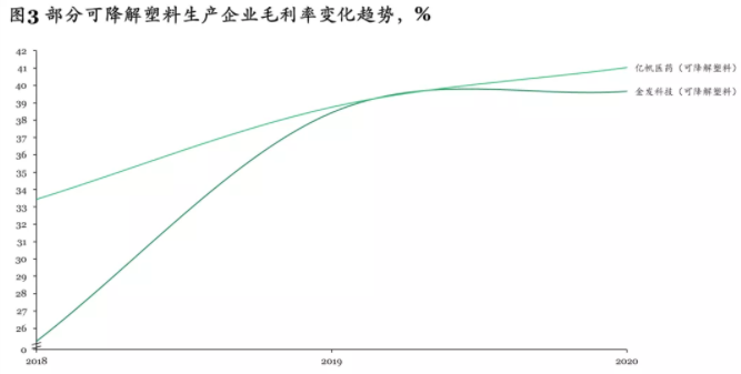 與此同時(shí),可降解塑料產(chǎn)品價(jià)格近一年來攀升,例如禁塑令前PLA價(jià)格為2萬元/噸,現(xiàn)在一些地方的市場(chǎng)價(jià)已高達(dá)5萬元/噸。這直接提升了行業(yè)整體盈利水平,例如金發(fā)科技、億帆醫(yī)藥等企業(yè)2019、2020年的毛利率均接近40%,相比2018年大幅提升(見圖3)。