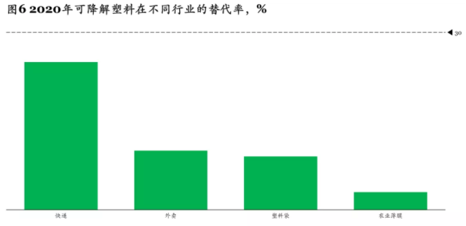 根據(jù)2020年“禁塑令”,主要限制使用的塑料制品有四類:塑料購物袋、一次性塑料餐具、賓館酒店一次性塑料用品和快遞塑料包裝,超薄塑料袋和超薄農(nóng)膜的生產(chǎn)和銷售也受到限制。目前可降解塑料在這些行業(yè)中的替代率均較低,最高為快遞行業(yè)的25%,最低為農(nóng)膜行業(yè)的3%,均低于美國、荷蘭等國家30%的平均替代率(見圖6)。