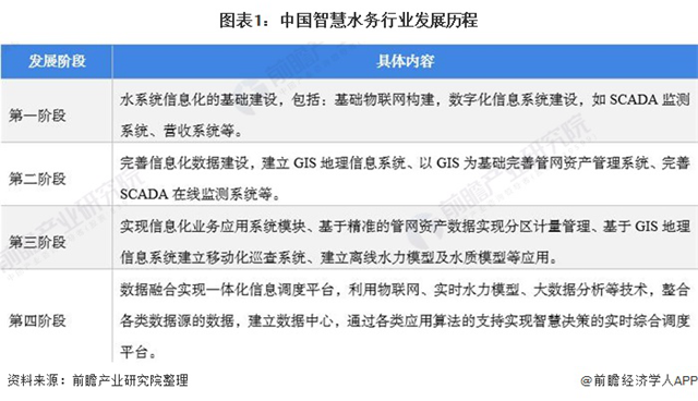 智慧水務(wù)是指利用物聯(lián)網(wǎng)、智能傳感、云計算、大數(shù)據(jù)等技術(shù)對供水、排水、節(jié)水、污水處理、防洪等水務(wù)環(huán)節(jié)進行智慧化管理。我國智慧水務(wù)經(jīng)歷了信息化的基礎(chǔ)建設(shè)、完善信息化數(shù)據(jù)和應(yīng)用模塊等建設(shè),行業(yè)正處于第四階段——數(shù)據(jù)融合實現(xiàn)一體化信息調(diào)度平臺階段。