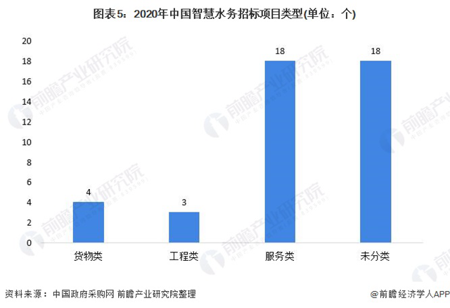 從項目類型來看,我國智慧水務(wù)項目采購內(nèi)容包括貨物類、工程類和服務(wù)類。2020年,我國智慧水務(wù)招標項目中貨物類項目4個,工程類項目3個,服務(wù)類項18個,未分類項目18個。