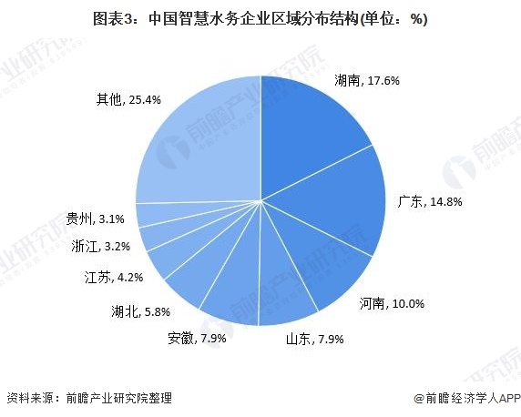 截至2021年6月9日,我國智慧水務(wù)行業(yè)企業(yè)(經(jīng)營范圍包含智慧水務(wù)的存續(xù)在業(yè)企業(yè))在湖南省的占比最大為17.6%,其次是廣東省,占比為14.8%。