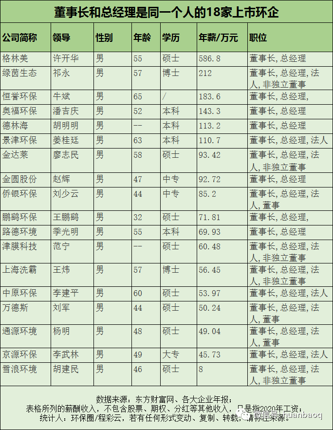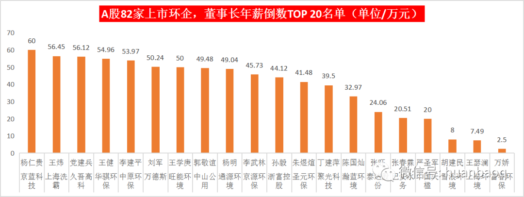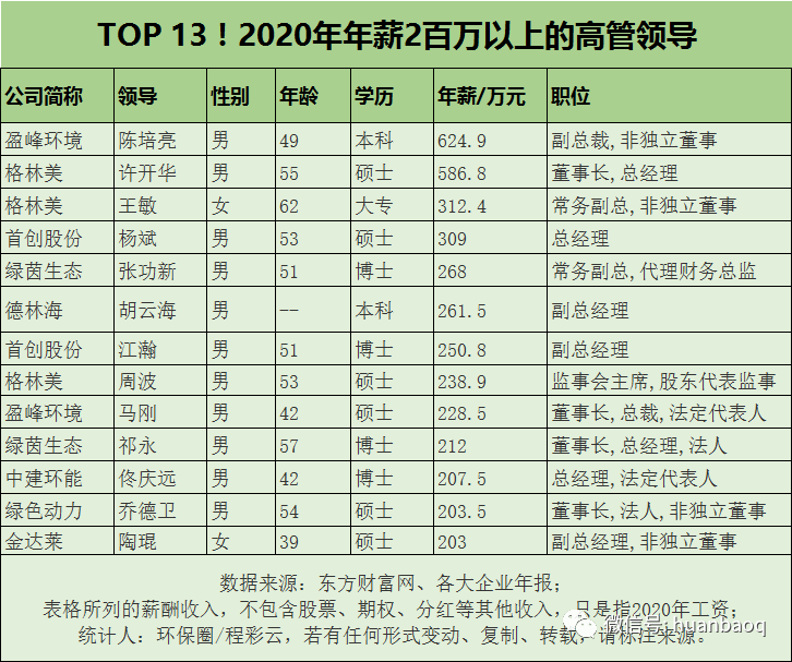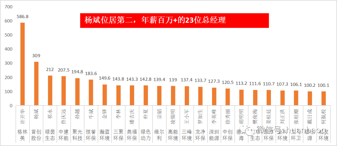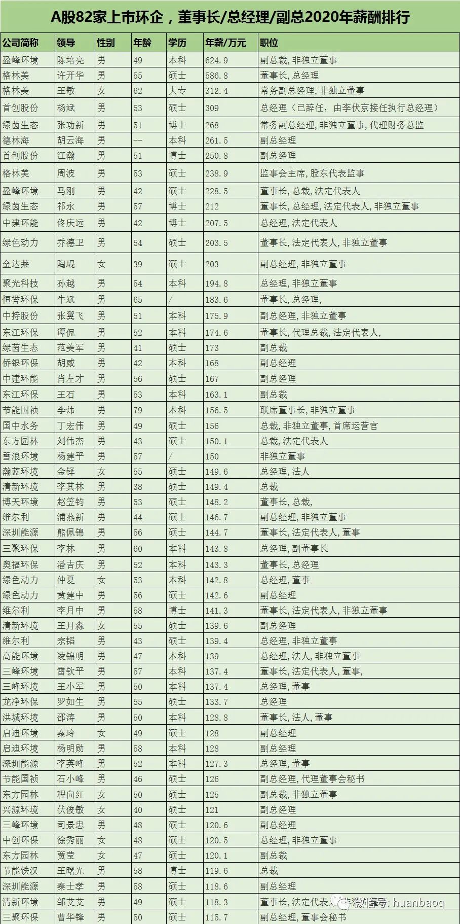 誰是環(huán)保行業(yè)“最強(qiáng)打工人”?首先來看看整體情況,應(yīng)該說,環(huán)保企業(yè)高管的薪酬水平差距還是挺大的。總體來看,217位上市環(huán)企高管,去年年薪累計(jì)高達(dá)2.1億元,平均每人97萬元/年,每月近9萬元。也就是說,從平均水平上看,環(huán)保企業(yè)高管的年薪已經(jīng)達(dá)到“百萬級”了。但事實(shí)上,每個(gè)人的情況差別非常大。最高的,可以拿到625萬元;最低的,則只有2.4萬元,足足相差了260倍,簡直是天壤之別。為了便于觀察,我們把高管年薪分為“100萬元以上”、“50萬-100萬元之間”,以及“50萬元以下”三個(gè)檔。217位高管中,年薪收入在百萬元以上的有71位,約占33%;年薪在50萬元-100萬元之間的有112位,約占52%;還有15%的企業(yè)高管,去年年薪收入在50萬元以下,約占15%左右(如圖一所示)。圖一:217位上市環(huán)企高管薪酬收入分布也就是說,217位高管中,有1/3收入較高,在100萬元以上;有一半收入居中,在50萬-100萬元之間;還有15%收入“偏低”,在50萬元以下。如果再拔高一個(gè)級別,看一看收入兩百萬元以上的,就只剩下為數(shù)不多的13個(gè)人了,分別供職于盈峰環(huán)境、格林美、首創(chuàng)股份、綠茵生態(tài)、中建環(huán)能、綠色動力等8家上市環(huán)企(如圖二所示)。圖二:年薪過200萬的13位上市環(huán)企高管其中,年薪最高的當(dāng)屬盈峰環(huán)境副總裁陳培亮,去年年薪高達(dá)625萬元,比總裁馬剛還要高出396萬元,可謂是環(huán)保領(lǐng)域的“最強(qiáng)打工人”。很多人或許對陳培亮還不夠了解,其實(shí)他在成為盈峰環(huán)境副總裁之前,就已經(jīng)有非常光鮮的履歷。早在10年前的2010年,38歲的他就已經(jīng)成為中聯(lián)重科的副總裁,在他的帶領(lǐng)下,中聯(lián)重科大力研發(fā)環(huán)衛(wèi)裝備制造,逐步成為環(huán)保行業(yè)的龍頭企業(yè)。正是由于其在環(huán)衛(wèi)裝備制造的杰出表現(xiàn),5年前,盈峰環(huán)境斥巨資從中聯(lián)重科購買中聯(lián)環(huán)境(現(xiàn)盈峰中聯(lián))全部股份,而作為中聯(lián)環(huán)境曾經(jīng)的總經(jīng)理陳培亮,自然也被委以重用,給予了非常高的薪酬。從盈峰中聯(lián)的表現(xiàn)來看,應(yīng)該說,這份年薪是他應(yīng)得的。排名第二的是格林美的兩位高管——55歲的董事長許開華(587萬元/年)和62歲的常務(wù)副總王敏(312萬元/年)。值得一提的是,相比2019年(年薪805萬元),許開華在2020年的年薪已經(jīng)“自降”了218萬元,這或許與公司去年的凈利潤下滑有關(guān)。217位上市環(huán)企高管中,有58位,占比約1/4的高管年薪在100萬元-200萬元之間。其中,年薪150萬元以上的有:中持股份副總經(jīng)理張翼飛、東江環(huán)保董事長譚侃、節(jié)能國禎創(chuàng)始人李煒、東方園林董事長劉偉杰、博天環(huán)境董事長趙笠鈞、瀚藍(lán)環(huán)境總經(jīng)理金鐸、清新環(huán)境總裁李其林、維爾利董事長李月中等。年薪在100萬元-150萬元之間的,多數(shù)都是成長較快、發(fā)展極具潛力的新上市環(huán)企,比如去年六五環(huán)境日剛上市的三峰環(huán)境,其董事長雷欽平、總經(jīng)理王小軍、副總經(jīng)理司景忠年薪都是在120萬元-140萬元之間。再如去年5月8日在科創(chuàng)板上市的金科環(huán)境,其董事長張慧春、總經(jīng)理劉正洪和副總經(jīng)理崔紅梅年薪也都在100萬元左右,其中張慧春和劉正洪薪資收入相同,去年年薪均為107萬元。總的來說,以上就是環(huán)保行業(yè)收入最高的群體了。從年薪上看,收入相對更高的還是民企,比如盈峰環(huán)境、格林美、維爾利,以及“混改”之前的中持股份、國禎環(huán)保、博天環(huán)境、清新環(huán)境等等。這些企業(yè),基本也代表著環(huán)保行業(yè)的最高水準(zhǔn),企業(yè)效益更好,所以高管薪酬更高也就不足為怪了。看完了整體的情況,再來看看董事長這個(gè)維度的排名。在“A股上市環(huán)企董事長年薪TOP20榜單”中,格林美的許開華以587萬元高居榜首,比第二名(盈峰環(huán)境董事長馬剛)和第三名(綠茵生態(tài)祁永)的總和還要高出150萬元。(如圖三所示)。圖三:A股82家上市環(huán)企,董事長年薪排名前TOP20也有的老板不舍得為自己開工資,在圖四“董事長年薪倒數(shù)TOP20榜單”中,2020年年薪最低的董事長只有2.5萬元,月平均工資約2000元,這水平都抵不上一位普通的職員。圖四:A股82家上市環(huán)企,董事長年薪倒數(shù)TOP20這位拿著2.5萬元年薪的董事長,就是富春環(huán)保董事長萬嬌。公開資料顯示,富春環(huán)保董事長萬嬌是一位1988年出生,年僅33歲的女掌門人,但其掌門的富春環(huán)保,市值則已高達(dá)56億元。眾所周知,富春環(huán)保是一家剛剛經(jīng)歷了“混改”的企業(yè),去年南昌市國資委剛剛?cè)胫?,萬嬌則是由南昌國資提名,代替原董事長的人選。事實(shí)上,在統(tǒng)計(jì)董事長薪資收入時(shí),我們發(fā)現(xiàn)了一個(gè)有趣的現(xiàn)象——好多上市環(huán)企,副總、總經(jīng)理的年薪都要高于董事長!甚至有的董事長(如首創(chuàng)股份劉永政),都沒有在公司領(lǐng)取任何報(bào)酬!不過,這些董事長收入較低的企業(yè),很多還都是業(yè)績表現(xiàn)不錯(cuò)的企業(yè),比如瀚藍(lán)環(huán)境、中國天楹、上海環(huán)境、富春環(huán)保等