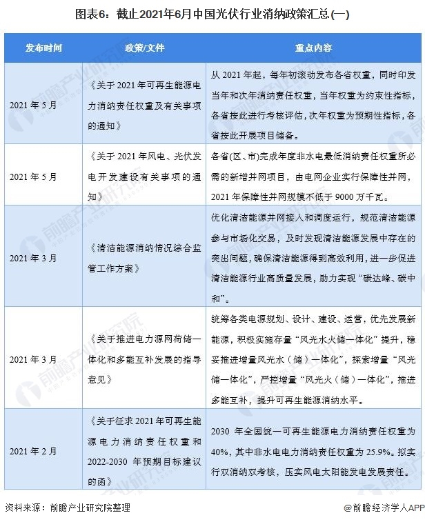 在光伏行業(yè)發(fā)展迅速的背景下,光伏行業(yè)消納問題已經(jīng)成為十分重要的部分。2021年是正式實(shí)施可再生能源電力消納保障機(jī)制的第一年。2021年5月25日,國家發(fā)改委、國家能源局正式發(fā)布《關(guān)于2021年可再生能源電力消納責(zé)任權(quán)重及有關(guān)事項(xiàng)的通知》,對各省可再生能源的消納考核指標(biāo)進(jìn)行了明確,再次表明了國家對壓實(shí)風(fēng)電、光伏發(fā)電發(fā)展責(zé)任的重視。截止2021年6月,我國光伏行業(yè)消納相關(guān)政策匯總?cè)缦拢?/div>