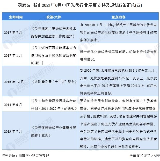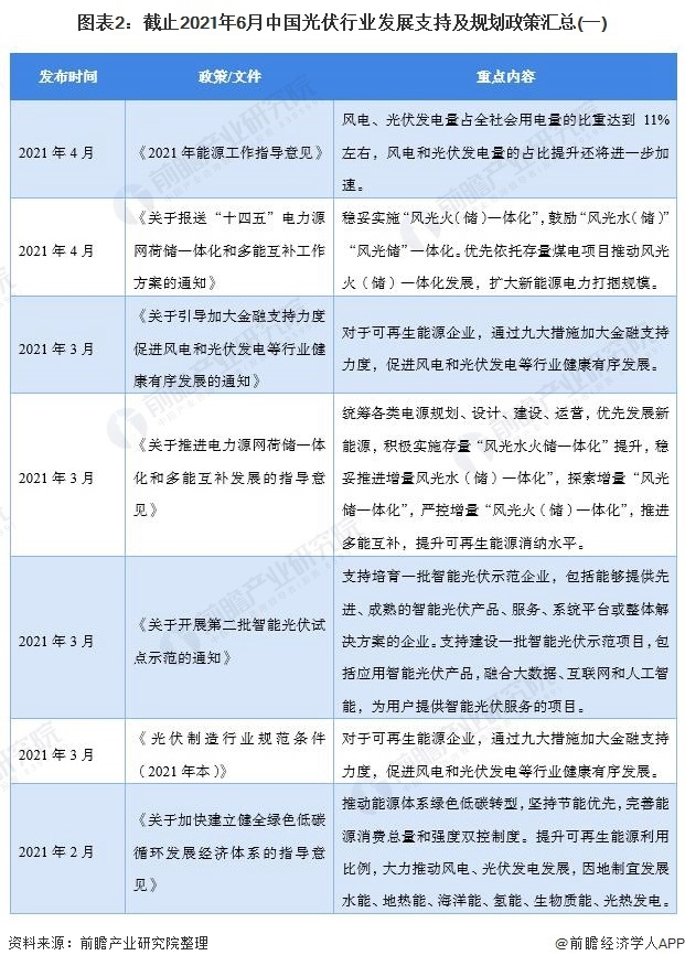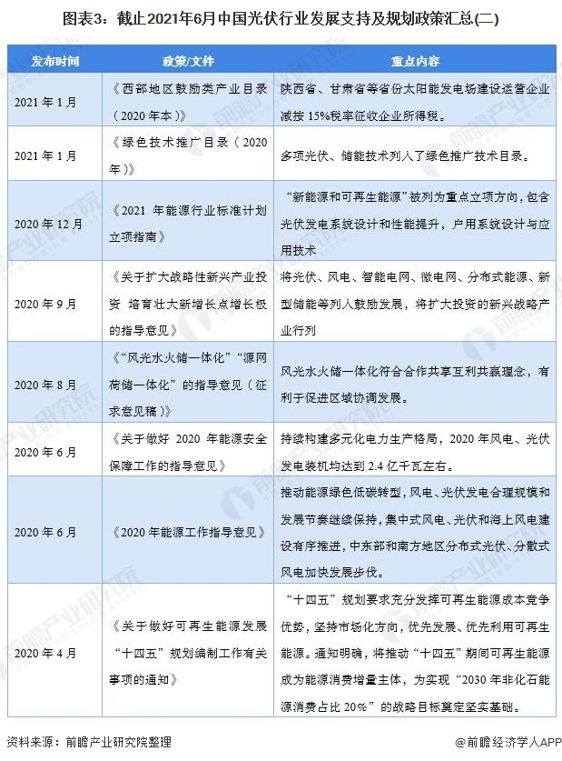 在光伏行業(yè)發(fā)展支持和發(fā)展規(guī)劃方面,我國出臺了大量政策,內(nèi)容涉及我國光伏發(fā)電規(guī)模及占比、光伏能源儲能政策、光伏企業(yè)經(jīng)濟(jì)扶持政策、光伏技術(shù)立項(xiàng)政策等。截止2021年6月,我國光伏行業(yè)相關(guān)發(fā)展支持政策及規(guī)劃如下: