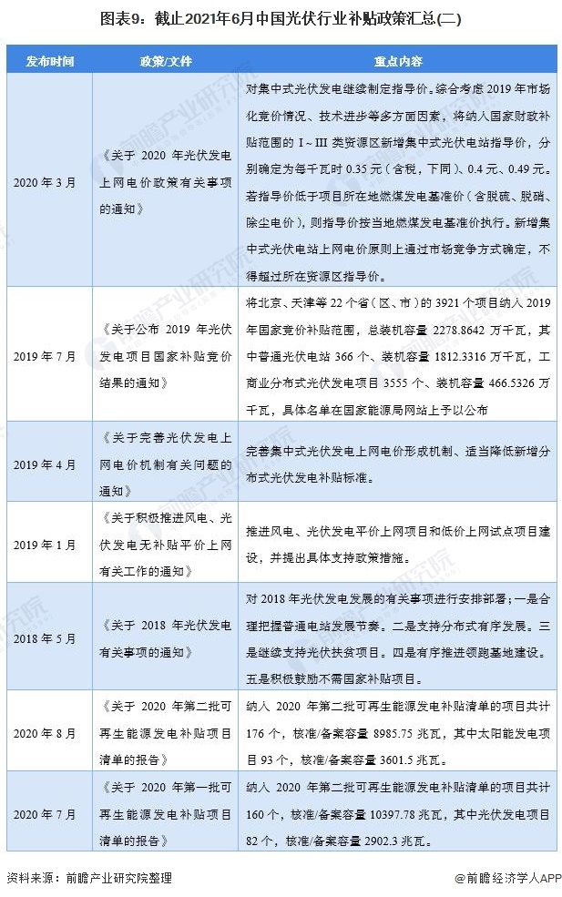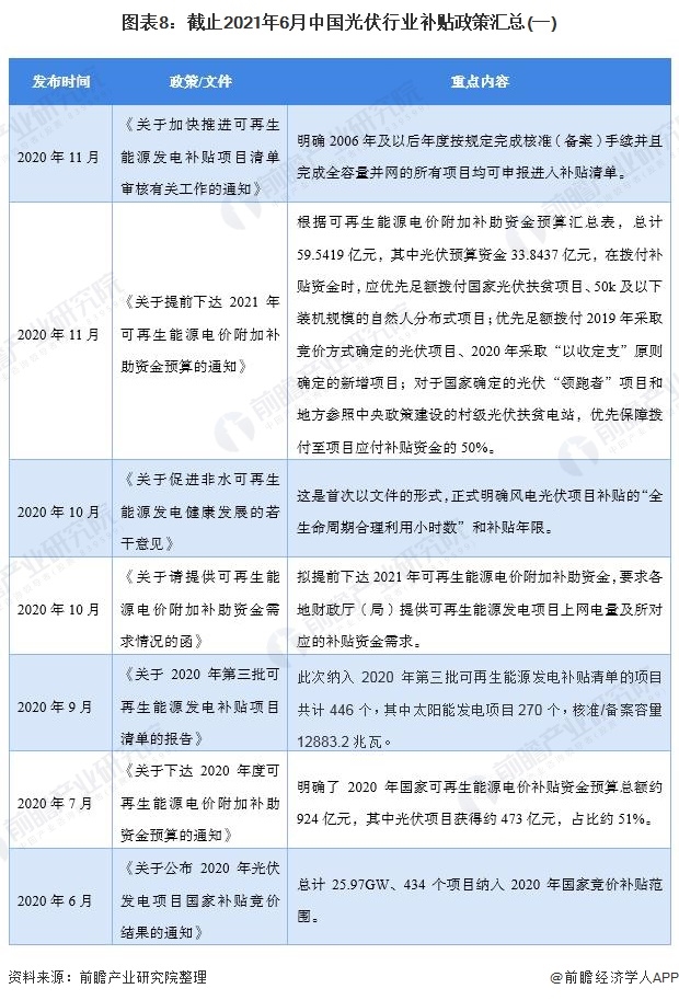 目前光伏能源還屬于進(jìn)步階段,推出相應(yīng)的補(bǔ)貼政策是有助于光伏能源推廣。雖然光伏電站維護(hù)和運(yùn)營成本相對較低,但目前光轉(zhuǎn)化效率不高,技術(shù)有待提高。所以當(dāng)前仍然需要國家給予補(bǔ)貼,使得光伏電站投資回報(bào)能和火電、水電競爭。截止截止2021年6月,我國光伏行業(yè)補(bǔ)貼相關(guān)政策匯總?cè)缦拢?/div>