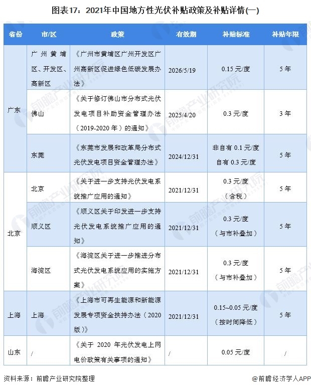 在我國光伏補(bǔ)貼方面,2021年的國家補(bǔ)貼戶用光伏電站3分/度,集中式光伏電站、工商業(yè)分布式光伏無補(bǔ)貼。但是很多省市對光伏電站包括光伏綠色建筑仍有補(bǔ)貼,分布式光伏未來發(fā)展空間巨大。例如廣東省廣州市三區(qū)、佛山市、東莞市等均出臺了不同的補(bǔ)貼政策,補(bǔ)貼標(biāo)準(zhǔn)有每度0.1元到每度0.3元不等。