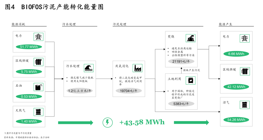 其二,30●60雙碳目標(biāo)提出后,未來污泥處理處置將以節(jié)能降耗及能源資源回收為目標(biāo),這對污泥處理提出了更為清晰的技術(shù)路徑方向。例如在能源回收上,厭氧消化是優(yōu)選途徑,如丹麥污水廠BIOFOS通過污泥消化產(chǎn)能實(shí)現(xiàn)能量盈余(見圖4)。