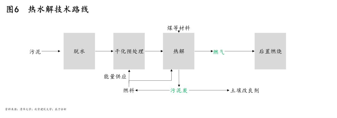 而在資源回收上,相比好氧堆肥,干化焚燒及熱水解則是更好的資源化方式,值得重點(diǎn)關(guān)注。干化焚燒的技術(shù)路線如圖5所示,作為快捷、徹底實(shí)現(xiàn)污泥減量化、穩(wěn)定化、無害化的最終處置技術(shù),干化焚燒后的資源化利用產(chǎn)品也更易走通;熱水解的技術(shù)路線如圖6所示,其生產(chǎn)過程清潔化,生成的污泥炭資源多樣化。