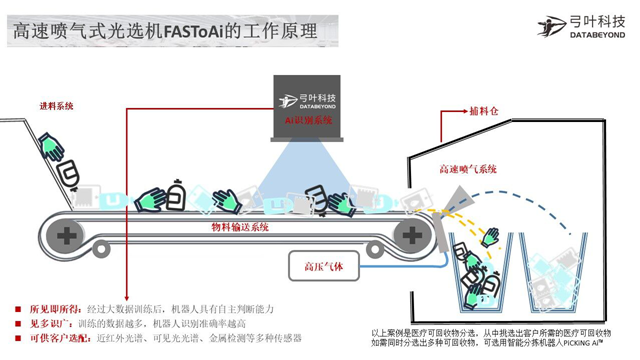 弓葉科技自主研發(fā)的智能垃圾分選裝備已實(shí)現(xiàn)落地應(yīng)用,目前參與了國內(nèi)多個垃圾處理項目,其中包含混合生活垃圾、可回收垃圾、廚余垃圾、餐廚垃圾、建筑垃圾等領(lǐng)域。同時,弓葉科技還將其剛推出的高速噴氣式光選機(jī)FASToAI運(yùn)用到了醫(yī)療廢棄物處理領(lǐng)域中,幫助醫(yī)療機(jī)構(gòu)及醫(yī)廢處置單位降本增效,實(shí)現(xiàn)了對醫(yī)用級塑料垃圾的準(zhǔn)確分選,同時大大降低了醫(yī)療工作人員垃圾分類的工作量與時間成本。