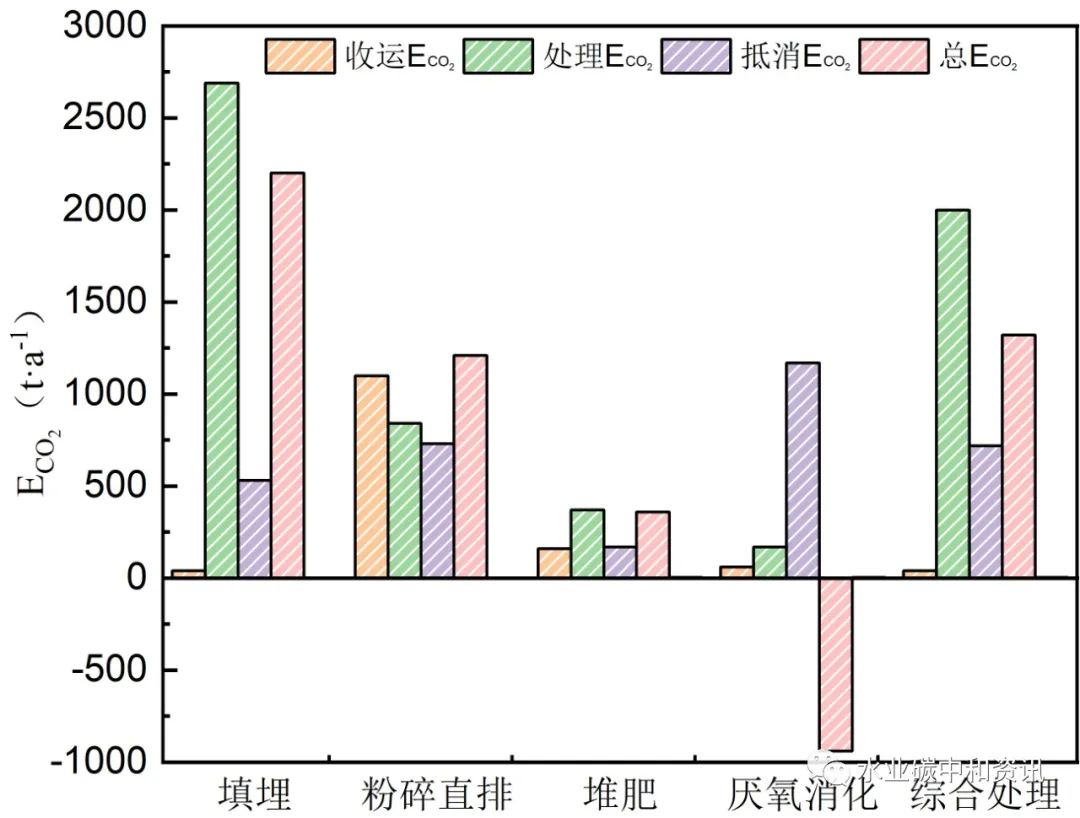 評估的LCA包括餐廚垃圾收集與運(yùn)輸、處理、產(chǎn)物各個處置環(huán)節(jié);LCA之碳排放涉及的溫室氣體包括CO2、N2O和CH4;N2O和CH4造成的溫室效應(yīng)分別乘以298、25折算為CO2當(dāng)量——ECO2。經(jīng)微生物分解代謝作用產(chǎn)生的CO2為生物成因(生源性),是有機(jī)物的自然歸宿,不列入碳排放計算;產(chǎn)生的CH4經(jīng)回收后用于發(fā)電或熱電聯(lián)產(chǎn)(CHP),這一途徑形成的碳排放不納入LCA碳排放匯總與計算。被回收的能源與資源可相應(yīng)地抵消碳排放量,主要包括由CH4用于發(fā)電或CHP后回收的電能或(和)熱能與可用作肥料的沼渣;產(chǎn)生的熱能除滿足自身升溫需求之外,未利用的剩余熱能不計入抵消ECO2項目內(nèi)。每kW·h電能可抵消0.608 kg ECO2,每kg肥料(以N計)可抵消4 kg ECO2。據(jù)此計算各餐廚垃圾處置方式對應(yīng)的年ECO2數(shù)據(jù)(圖3)。
