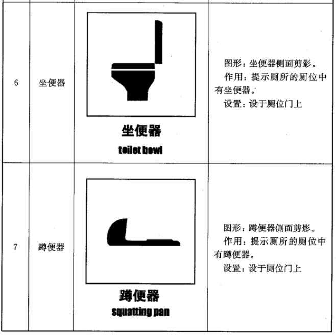 按照標(biāo)準(zhǔn)CJJ/T 125-2008《環(huán)境衛(wèi)生圖形符號標(biāo)準(zhǔn)》,公廁相關(guān)的主要圖形如上圖所示。