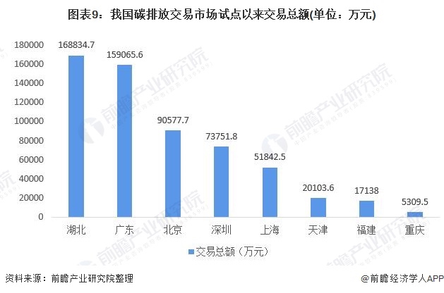 根據(jù)中國碳排放交易網(wǎng)公布的數(shù)據(jù)來看從2013年各地試點以來,湖北省的碳排放權(quán)交易總額為七個地區(qū)之中最高為16.88億元。