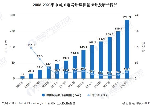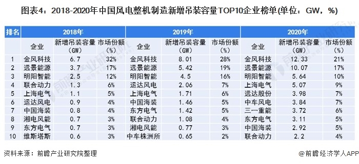 注:①CWEA在統(tǒng)計的數(shù)據(jù)僅公布至2018年,2019-2020年為前瞻根據(jù)BloombergNEF公布的所有風(fēng)電機制造廠商年度新增裝機量加總所得;