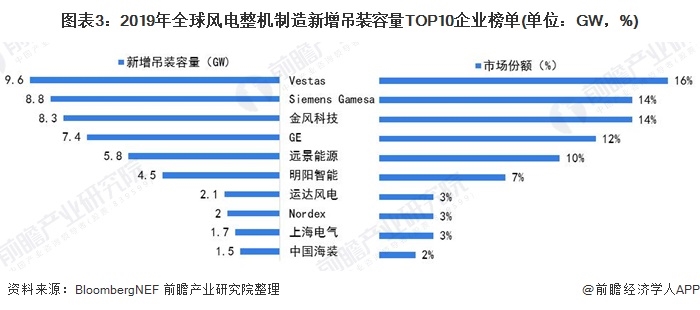 目前,我國以金風(fēng)科技、遠景能源、明陽智能等為代表的風(fēng)電整機制造商技術(shù)已經(jīng)基本達到國際平均水平。據(jù)BloombergNEF數(shù)據(jù)顯示,2019年我國共有6家中國企業(yè)進入全球風(fēng)電新增裝機容量前十榜單。其中,金風(fēng)科技排名第三,僅次于丹麥企業(yè)Vestas和西班牙企業(yè)Siemens Gamesa。其它入榜中國企業(yè)還包括遠景能源、明陽智能、運達風(fēng)電、上海電氣和中國海裝。