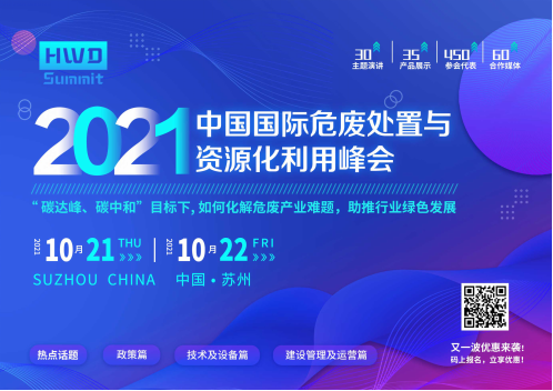 至此,2021中國國國際危廢處置與資源化利用峰會將于2021年10月21-22日在蘇州舉辦,會議以“ “碳達峰、碳中和”目標下, 如何化解危廢產(chǎn)業(yè)難題,助推行業(yè)綠色發(fā)展 ”為主題,將聚焦十四五產(chǎn)業(yè)規(guī)劃,探索危廢行業(yè)技術與應用創(chuàng)新,助力國內(nèi)外企業(yè)加快市場布局,促進產(chǎn)業(yè)各方的交流合作!屆時歡迎相關企業(yè)及行業(yè)專家、學者踴躍參加!