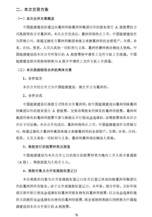 公告顯示,中國能源建設(shè)向葛洲壩除葛洲壩集團以外的所有股東發(fā)行中國能源建設(shè) A 股股票,交換其所持有的葛洲壩股票。葛洲壩集團所持有的葛洲壩股票不參與換股且不行使現(xiàn)金選擇權(quán),該等股票將在本次換股吸收合并后予以注銷。本次換股吸收合并完成后,葛洲壩將終止上市,中國能源建設(shè)作為存續(xù)公司,將通過接收方葛洲壩集團承繼及承接葛洲壩的全部資產(chǎn)、負債、業(yè)務(wù)、合同、資質(zhì)、人員及其他一切權(quán)利與義務(wù),葛洲壩最終將注銷法人資格。同時,中國能源建設(shè)的 A 股股票將申請在上交所上市流通,中國能建集團、國新控股、誠通金控及電規(guī)院持有的中國能源建設(shè)原內(nèi)資股將轉(zhuǎn)換為 A 股并申請在上交所上市流通。