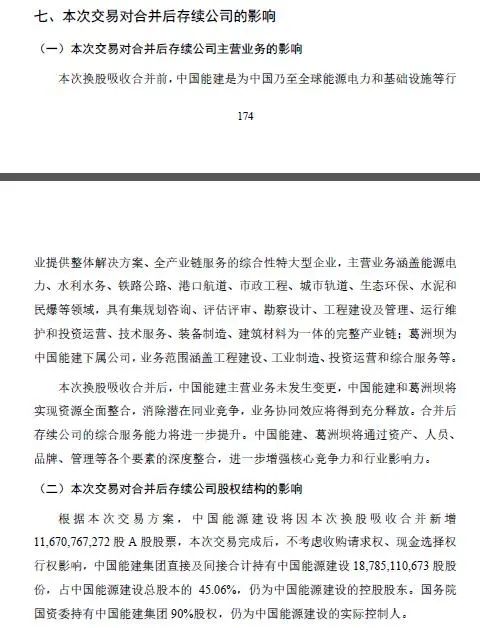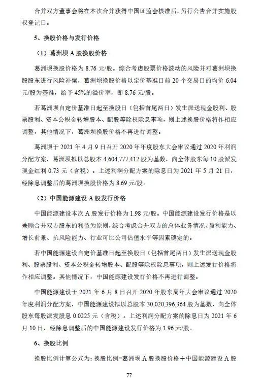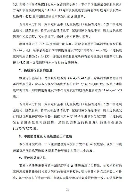 另悉,中國能源建設(shè)為本次合并發(fā)行的股份數(shù)量合計為11,645,760,553股。若合并雙方任何一方自定價基準日起至換股日(包括首尾兩日)發(fā)生派送現(xiàn)金股利、 股票股利、資本公積金轉(zhuǎn)增股本、配股等除權(quán)除息事項,上述換股發(fā)行的股份數(shù)量相應(yīng)調(diào)整,經(jīng)除息調(diào)整后的換股發(fā)行的股份數(shù)量為11,670,767,272股。