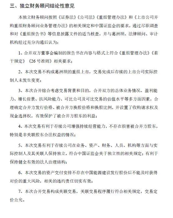 獨立財務(wù)顧問結(jié)論性意見顯示,本次交易不構(gòu)成葛洲壩的重組上市,交易完成后存續(xù)的上市公司實際控制人未發(fā)生變更;本次交易有利于存續(xù)公司增強持續(xù)經(jīng)營能力,不存在損害被合并方股東,特別是非關(guān)聯(lián)股東合法權(quán)益的情況;本次合并交易構(gòu)成關(guān)聯(lián)交易,關(guān)聯(lián)交易程序履行符合相關(guān)規(guī)定,交易定價公允。