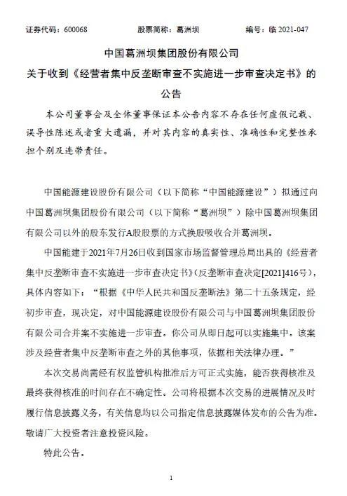 另據(jù)相關(guān)監(jiān)管部門對葛洲壩出具的《經(jīng)營者集中反壟斷審查不實施進一步審查決定書》顯示:“經(jīng)初步審查,現(xiàn)決定,對中國能源建設(shè)股份有限公司與中國葛洲壩集團股份有限公司合并案不實施進一步審查。你公司從即日起可以實施集中。該案涉及經(jīng)營者集中反壟斷審查之外的其他事項,依據(jù)相關(guān)法律辦理”。