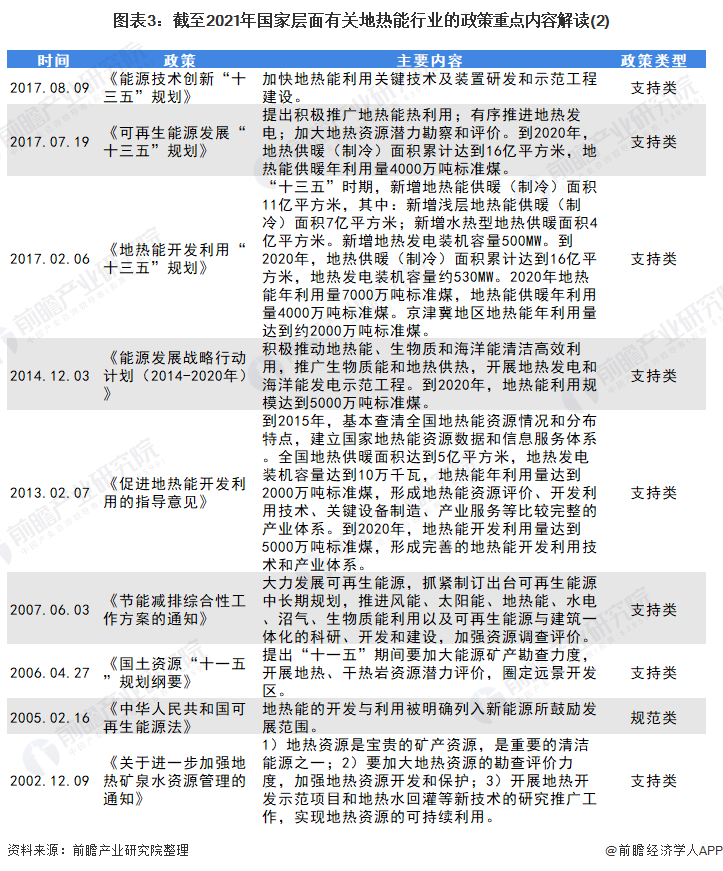 自2002年以來(lái),我國(guó)發(fā)布的多項(xiàng)可再生能源和節(jié)能減排相關(guān)政策及規(guī)劃加快推動(dòng)了我國(guó)地?zé)崮艿陌l(fā)展,如2021年4月最新發(fā)布的《關(guān)于促進(jìn)地?zé)崮荛_(kāi)發(fā)利用的若干意見(jiàn)(征求意見(jiàn)稿)》明確提到未來(lái)五年的地?zé)崮芄┡娣e目標(biāo),推動(dòng)地?zé)崮苁袌?chǎng)的開(kāi)發(fā)和投資。