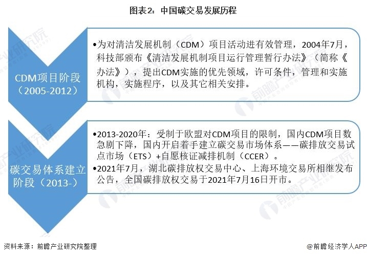我國碳交易體系建立階段包括碳交易試點與全國統(tǒng)一碳排放權交易兩個階段。2013年起,我國借鑒歐盟碳交易機制(EU-ETS),在北京、天津、上海、湖北、廣東、深圳、重慶、福建、四川九個省市開啟區(qū)域碳排放交易試點。2021年7月16日,全國碳排放權交易開市。