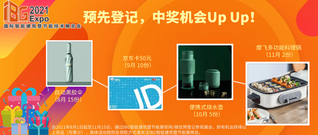 據(jù)悉,“IBG國際智能建筑暨節(jié)能技術(shù)展覽會”觀眾預登記已開啟,自8月開始至11月預登記的觀眾有機會享自動黑膠傘、京東卡、便攜式燒水壺、摩飛多功能料理鍋等實用好禮!活動獎品可累計,越早登記中獎機會越多。主辦方期待于2021年11月30日-12月2日與更多業(yè)內(nèi)人士相聚上海新國際博覽中心,共筑智能建筑生態(tài)圈!