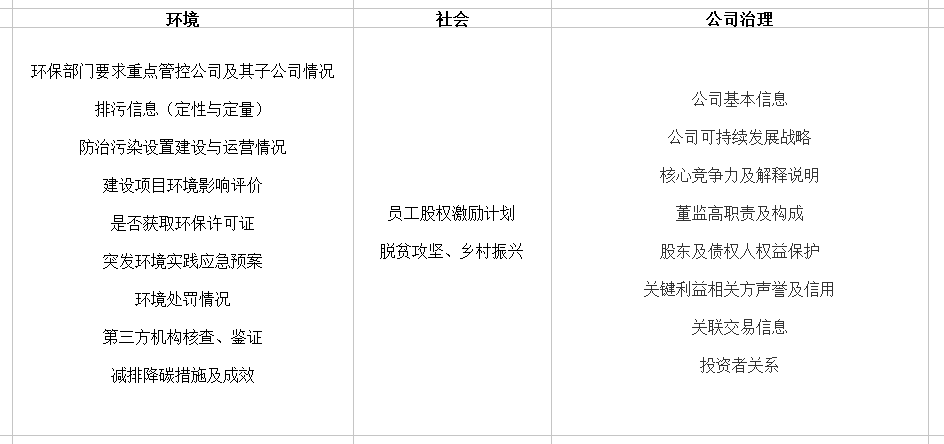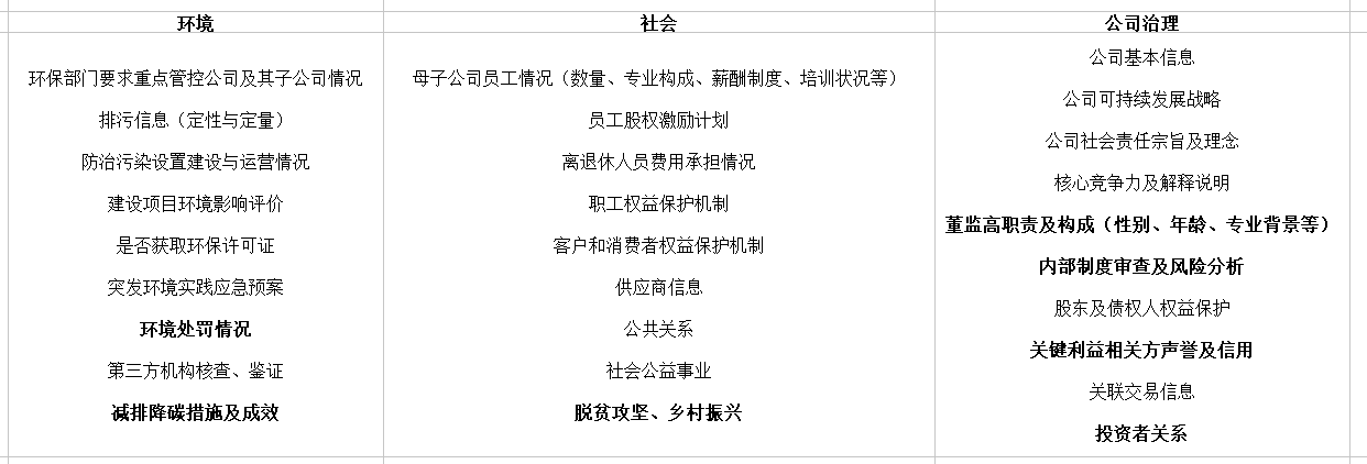 隨著可持續(xù)發(fā)展理念在國(guó)內(nèi)的逐步推進(jìn),2021年6月證監(jiān)會(huì)發(fā)布了《公開發(fā)行證券的公司信息披露內(nèi)容與格式準(zhǔn)則第2號(hào)—年度報(bào)告的內(nèi)容與格式(2021年修訂)》(以下簡(jiǎn)稱《年報(bào)格式準(zhǔn)則(2021修訂)》)和《公開發(fā)行證券的公司信息披露內(nèi)容與格式準(zhǔn)則第3號(hào)—半年度報(bào)告的內(nèi)容與格式(2021年修訂)》(以下簡(jiǎn)稱《半年報(bào)格式準(zhǔn)則(2021修訂)》)。相較于證監(jiān)會(huì)2017年發(fā)布的年報(bào)格式準(zhǔn)則,《年報(bào)格式準(zhǔn)則(2021修訂)》進(jìn)一步明確了上市企業(yè)ESG信息披露標(biāo)準(zhǔn)和格式。從環(huán)境層面,《年報(bào)格式準(zhǔn)則(2021修訂)》不僅要求企業(yè)定性、定量的對(duì)排污信息進(jìn)行披露,還要求企業(yè)披露報(bào)告期內(nèi)因環(huán)境問(wèn)題受到的行政處罰情況。此外,還鼓勵(lì)企業(yè)披露所采取的減少碳排放措施及減排效果,引導(dǎo)企業(yè)提高對(duì)環(huán)境保護(hù)及減排降碳的關(guān)注度。從社會(huì)層面,《年報(bào)格式準(zhǔn)則(2021修訂)》綜合我國(guó)目前經(jīng)濟(jì)發(fā)展?fàn)顩r,對(duì)信息披露要求進(jìn)行更新,比如將原本要求披露的“履行扶貧社會(huì)責(zé)任的情況”變更為“鞏固脫貧攻堅(jiān)、鄉(xiāng)村振興等工作情況”。從公司治理層面,《年報(bào)格式準(zhǔn)則(2021修訂)》提出了公司關(guān)鍵利益相關(guān)方的信譽(yù)及信用管理,完善企業(yè)內(nèi)部多維度監(jiān)管和定期審核評(píng)估,強(qiáng)化了企業(yè)對(duì)投資者的管理。