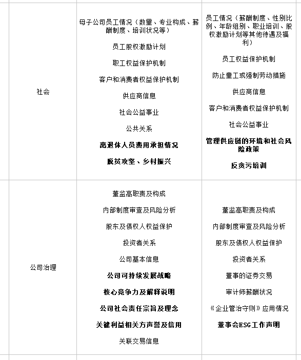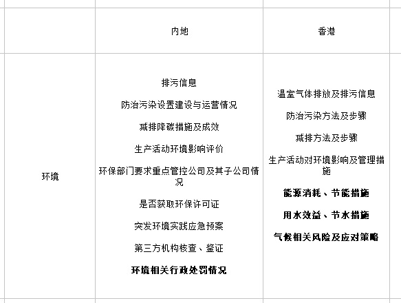 環(huán)境層面而言,內(nèi)地證監(jiān)會(huì)發(fā)布的企業(yè)年報(bào)、半年報(bào)格式準(zhǔn)則和港交所發(fā)布的《ESG指引》中都對(duì)企業(yè)排污狀況及減排措施和成果的信息披露提出要求。港交所發(fā)布的《ESG指引》中還要求上市企業(yè)能源消耗、用水效益進(jìn)行披露,同時(shí)企業(yè)也被要求披露節(jié)能節(jié)水措施?!禘SG指引》中還強(qiáng)調(diào)了企業(yè)需要提高對(duì)氣候變化相關(guān)風(fēng)險(xiǎn)的關(guān)注度,內(nèi)地上市企業(yè)則被要求在年報(bào)和半年報(bào)中公布因環(huán)境問(wèn)題受到的行政處罰情況。社會(huì)層面,兩地上市企業(yè)有關(guān)ESG的信息披露要求中所涉及的指標(biāo)總體上較為相似。港交所發(fā)布的《ESG指引》中強(qiáng)調(diào)了企業(yè)要對(duì)供應(yīng)鏈的可持續(xù)發(fā)展能力加大關(guān)注力度,同時(shí)也要求企業(yè)公布對(duì)董事和員工的反貪腐培訓(xùn)情況。內(nèi)地證監(jiān)會(huì)則結(jié)合了內(nèi)地經(jīng)濟(jì)發(fā)展?fàn)顩r和政策形勢(shì),要求企業(yè)披露鄉(xiāng)村振興和脫貧攻堅(jiān)工作進(jìn)展。公司治理層面,兩地都對(duì)董事會(huì)推動(dòng)企業(yè)內(nèi)部ESG工作作出要求。兩地的要求中都提及了企業(yè)需要對(duì)董監(jiān)高構(gòu)成及職責(zé)進(jìn)行說(shuō)明,同時(shí)也要求上市企業(yè)披露有關(guān)內(nèi)部管理制度、風(fēng)險(xiǎn)管理狀況及股東和債權(quán)人權(quán)益保護(hù)的信息。《ESG指引》中特別要求了董事會(huì)必須發(fā)布有關(guān)ESG相關(guān)工作參與情況的聲明,以此督促董事會(huì)對(duì)ESG工作的實(shí)質(zhì)性參與。內(nèi)地現(xiàn)行的上市企業(yè)年報(bào)、半年報(bào)格式準(zhǔn)則中則要求企業(yè)在“公司治理”板塊中對(duì)公司社會(huì)責(zé)任宗旨及理念、可持續(xù)發(fā)展戰(zhàn)略以及核心競(jìng)爭(zhēng)力進(jìn)行說(shuō)明。