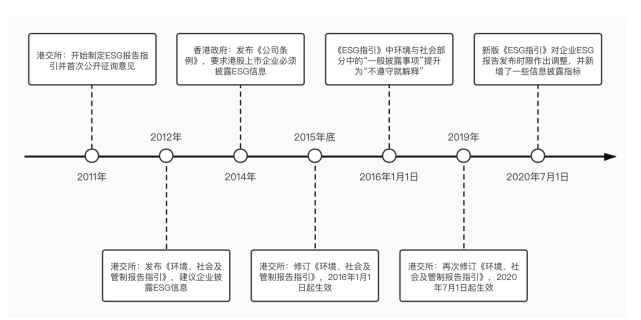 香港聯(lián)合交易所(以下簡(jiǎn)稱“港交所”)相較于內(nèi)地兩家交易所更早的地對(duì)上市企業(yè)ESG信息披露作出強(qiáng)制性要求。2011年港交所就開始了對(duì)ESG信息披露的實(shí)踐探索,開始制定ESG報(bào)告指引并首次公開征詢意見(jiàn)。次年,港交所便發(fā)布了《環(huán)境、社會(huì)及管治報(bào)告指引》(以下簡(jiǎn)稱《ESG指引》),建議企業(yè)披露ESG相關(guān)信息。2014年,香港特區(qū)政府發(fā)布《公司條例》,要求港股上市企業(yè)必須進(jìn)行ESG信息披露。港交所先后在2015年和2019年對(duì)《ESG指引》進(jìn)行修訂,2019年底修訂的最新版指引中首先對(duì)企業(yè)ESG報(bào)告發(fā)布時(shí)間進(jìn)行調(diào)整,規(guī)定企業(yè)必須在財(cái)年結(jié)束后5個(gè)月內(nèi)發(fā)布ESG報(bào)告,提升了ESG信息的時(shí)效性。同時(shí)新版指引還鼓勵(lì)報(bào)告發(fā)行人尋求第三方機(jī)構(gòu)進(jìn)行鑒證,以加強(qiáng)報(bào)告信息的可信性。