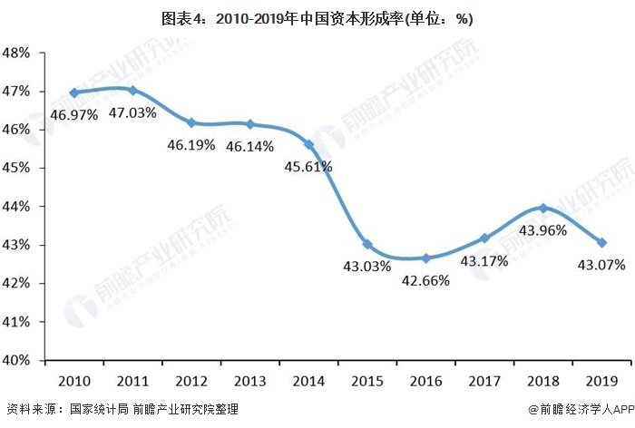 2007年以來(lái),中國(guó)資本形成率(一定時(shí)期內(nèi)資本形成總額占國(guó)內(nèi)生產(chǎn)總值的比重)維持在40%以上,2011年為47.03%,為近些年資本形成率最高年份,隨后呈下降趨勢(shì),2019年資本形成率達(dá)43.07%。資本形成率有待提升。