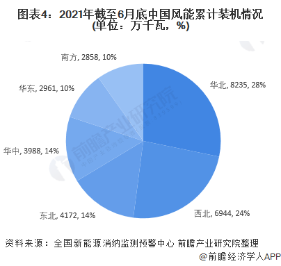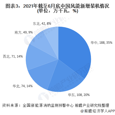 2021年1-6月,華中地區(qū)和華東地區(qū)的新增裝機(jī)容量較多,分別達(dá)到188萬千瓦和108萬千瓦。截止2021年6月底,華北地區(qū)和西北地區(qū)的風(fēng)能累計裝機(jī)容量占比超過全國一半,分別達(dá)到28%和24%。