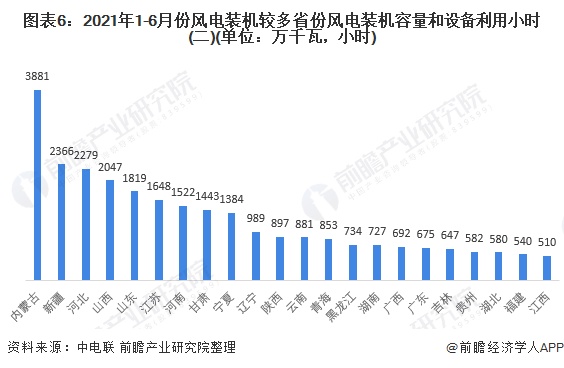 按照裝機(jī)容量來看,2021年1-6月,內(nèi)蒙古、新疆和河北的裝機(jī)容量位列全國前三;其中內(nèi)蒙古的風(fēng)能裝機(jī)容量突破3500萬千瓦,位列全國第一。并且有9個省市的風(fēng)能裝機(jī)容量突破1000萬千瓦。