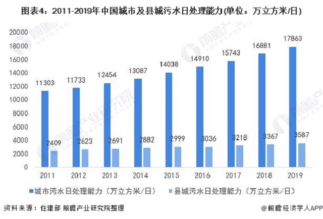 得益于污水處理設(shè)施的建設(shè),城市及縣城污水處理能力穩(wěn)步提升。城市污水日處理能力由2011年的11303萬立方米/日上升至2019年的17863萬立方米/日;縣城污水日處理能力也由2011年的2409萬立方米/日上升至2019年的3587萬立方米/日。
