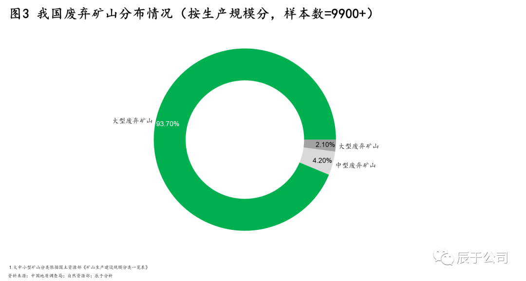 根據(jù)中國地質(zhì)調(diào)查局對國內(nèi)9900多座廢棄礦山的統(tǒng)計數(shù)據(jù)顯示,小型廢棄礦山占93.7%,中型、大型則分別占4.2%、2.1%(見圖3)。由于小型廢棄礦山數(shù)量多、規(guī)模小、碎片化、流動性大等問題,礦山生態(tài)修復(fù)責(zé)任主體缺失嚴(yán)重。