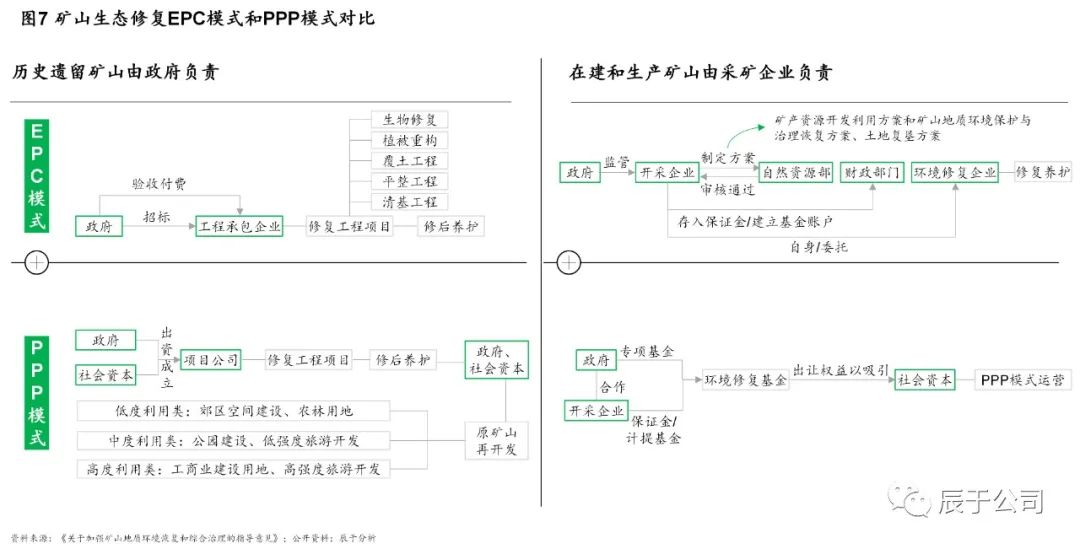 三是打開后期運營市場。2019年12月自然資源部出臺的《關(guān)于探索利用市場化方式推進礦山生態(tài)修復(fù)的意見》則在保障投資主體的收益取得突破,通過鼓勵礦山土地綜合修復(fù)利用、實行差異化土地供應(yīng)、盤活礦山存量建設(shè)用地、合理利用廢棄礦山土石料等,進一步解決礦山生態(tài)修復(fù)歷史欠賬多、現(xiàn)實矛盾多、投入不足等突出問題。