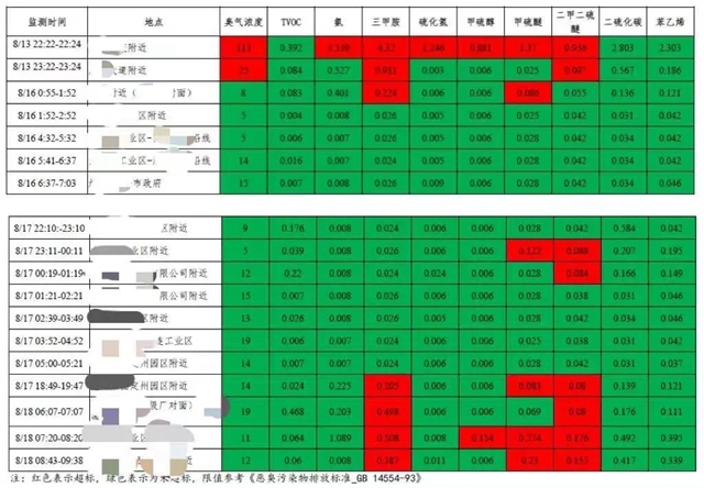 針對(duì)某市重點(diǎn)涉氣企業(yè)進(jìn)行惡臭走航監(jiān)測(cè),結(jié)果顯示某固廢附近、某垃圾廠對(duì)面、某工業(yè)區(qū)及某企業(yè)廠界附近均出現(xiàn)惡臭超標(biāo)現(xiàn)象。尤其是某固廢附近,在一處垃圾處理車(chē)間附近有刺鼻惡臭,監(jiān)測(cè)數(shù)據(jù)顯示臭氣濃度、氨、三甲胺、硫化氫、甲硫醇、甲硫醚、二甲二硫醚均處于高濃度,分別超標(biāo) 4.7 倍、1.4 倍、53.0倍、19.8 倍、124.9倍、18.6 倍、14.6 倍,惡臭污染嚴(yán)重。監(jiān)測(cè)期間,甲硫醇、甲硫醚、二甲二硫醚濃度均明顯上升,且均超標(biāo)。